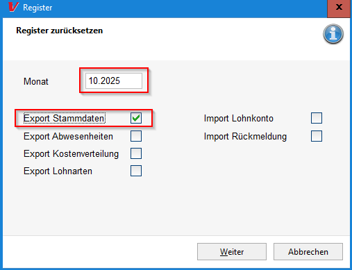 - Im Feld Monat "10.2025" eintragen und die Option "Export Stammdaten" anhaken.